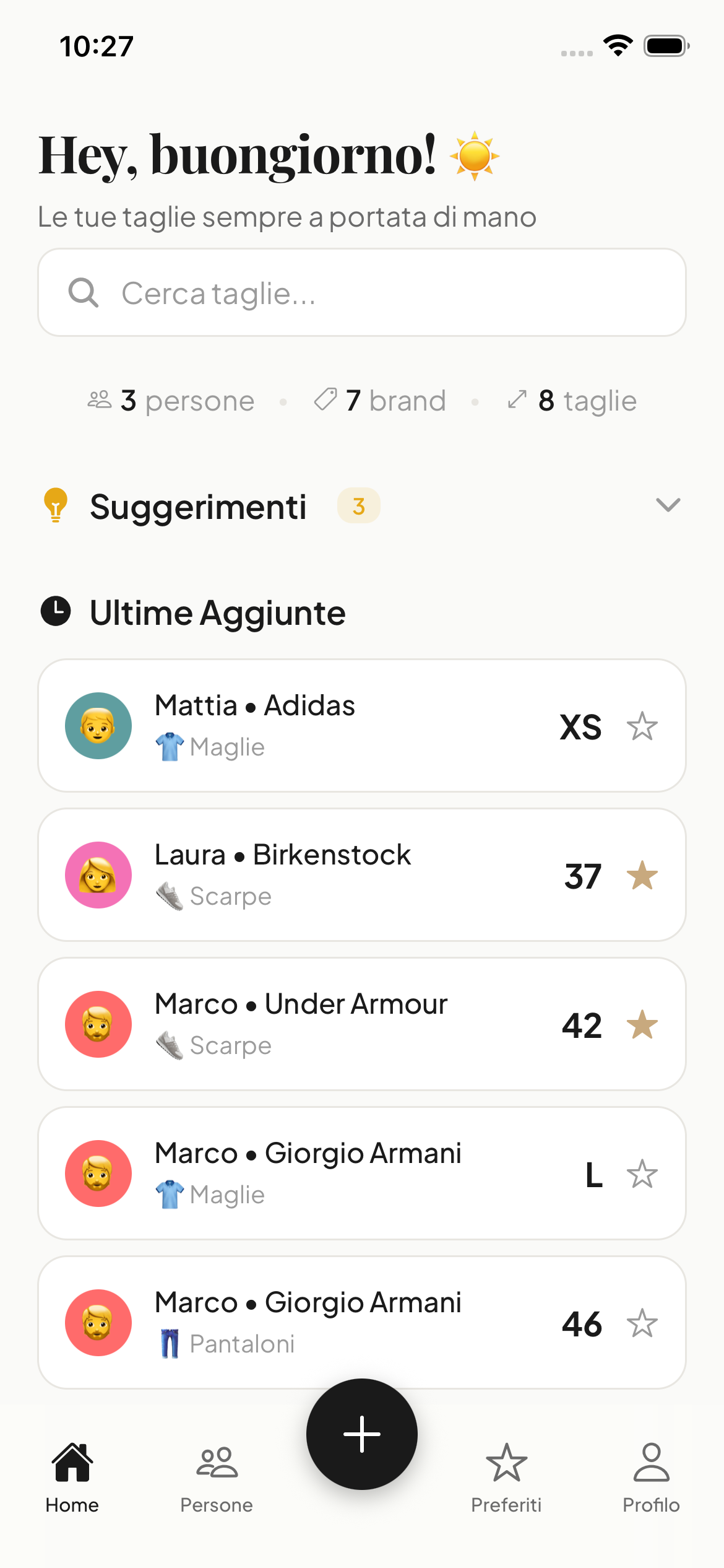 Crea profili per te, i tuoi familiari e amici. Ogni persona ha le sue taglie organizzate.